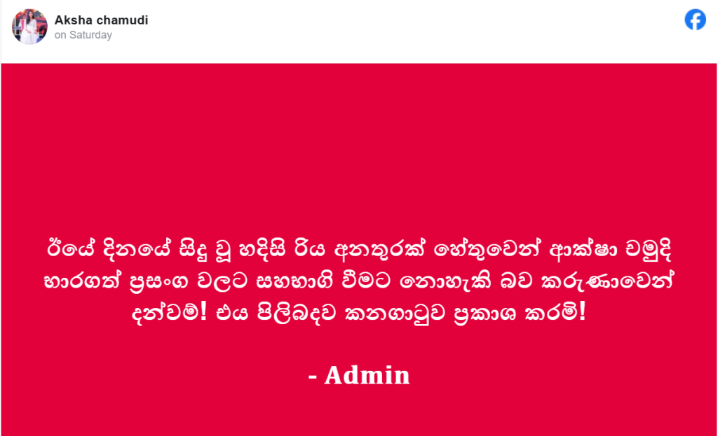 ජනප්රිය ගායන ශිල්පිනී ආක්ෂා චමුදි ඊයේ (26) දින මුහුණ දුන් හදිසි රිය අනතුරක් හේතුවෙන් ඇය මේ දිනවල සහභාගී වීමට නියමිතව තිබූ ප්රසංග රැසකට සහභාගී වීමට නොහැකි බව නිල වශයෙන් දැනුම් දී තිබේ.