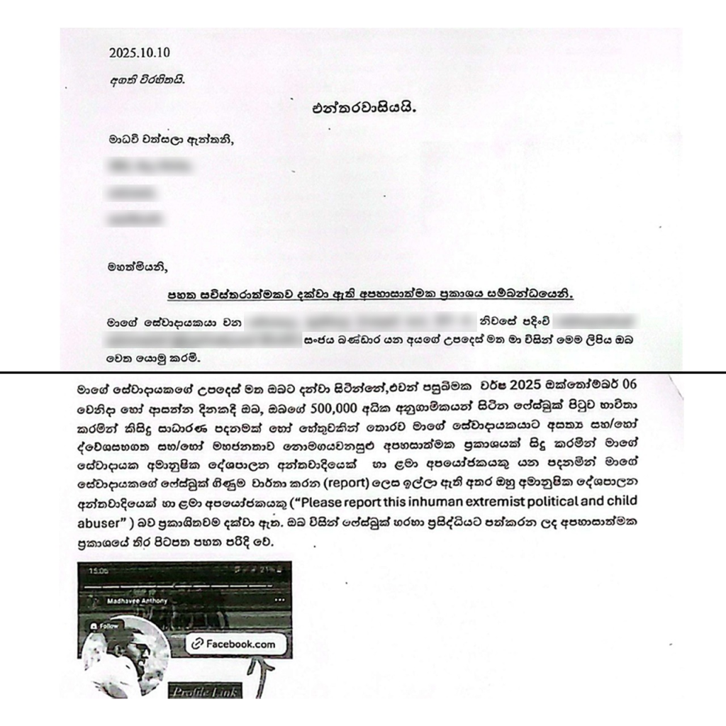 මාධවී වත්සලා ඇන්තනී යන අය විසින් සිය ෆේස්බුක් පිටුවේ සිදුකල පලකිරීමකින් තමාට සිදුකල අපහාසය සම්බන්ධයෙන් රුපියල් මිලියන 100 ක වන්දි මුදලක් ඉල්ලමින් සන්ජය බණ්ඩාර යන අය විසින් ඔහුගේ නීතිඥවරුන් හරහා එන්තරවාසි යවා තිබේ.