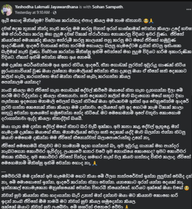 “ඇයි හොඳ මිනිස්සුම? විස්වාස කරන්නද එපාද කියල මම තාම හිතනවා. දවස් දෙක තුනක් නින්ද නැති කරපු, මම කරපු පිනත් අරන් හාස්කමක් වෙන්න කියලා උදේ හවස මම ප්රාර්ථනා කරපු මහ පුදුම දවස් ටිකක් ප්රාර්ථනා නොකරපු විදියට ඉවර වුණා. ජීවිතේ කියන්නේ මොකක්ද කියලා තේරුම් කරපු කාලයක් පහු කරපු මට මගේ ජීවිතේ හමුවුණ ආදරණීයම, ආදරේ වාතයක් වෙන තරම්ම හොයලා බලපු හැමදේටම ළගින් හිටපු අහිංසක බැඳීමක් නැති වුණා. විස්වාස කරන්න මිනිස්සු අහිමි වෙන්නේ මහ පුදුම විදියට හරිම අකාරුණික විදියට. ඒකත් අහිමි වෙන්න ඔ්නෙ අය නෙවෙයි.