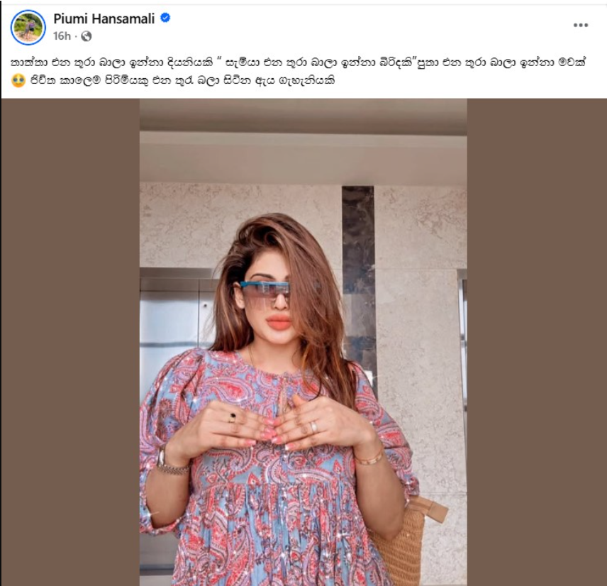 සමාජ මාධ්‍යයේ අතිශය ජනප්‍රිය චරිතයක් වුණු පියුමි සිය මුහුණු පොතට සටහනක් එක්කර තිබුණා.