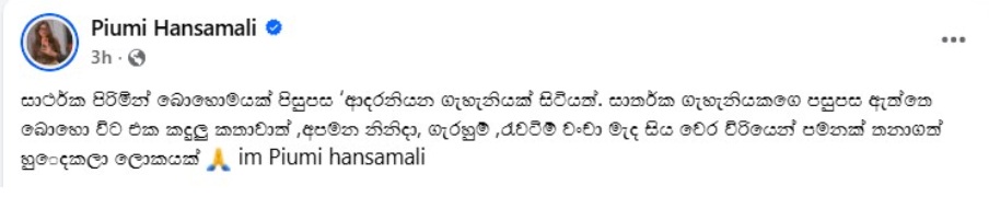 සමාජ මාධ්යයේ අතිශය ජනප්රිය චරිතයක් වුණු පියුමි සිය ෆේස්බුක් ගිණුමට එකතු කරපු සටහනක් මේ…