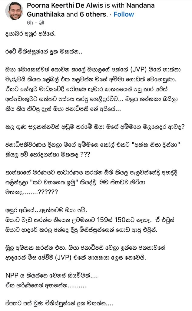 ප්රේමකීර්ති ද අල්විස් මහතාගේ පුත් පූර්ණ කීර්ති සිය මුහුණු පොතේ ආන්දෝලනාත්මක සටහනක් තබා තිබෙනවා.