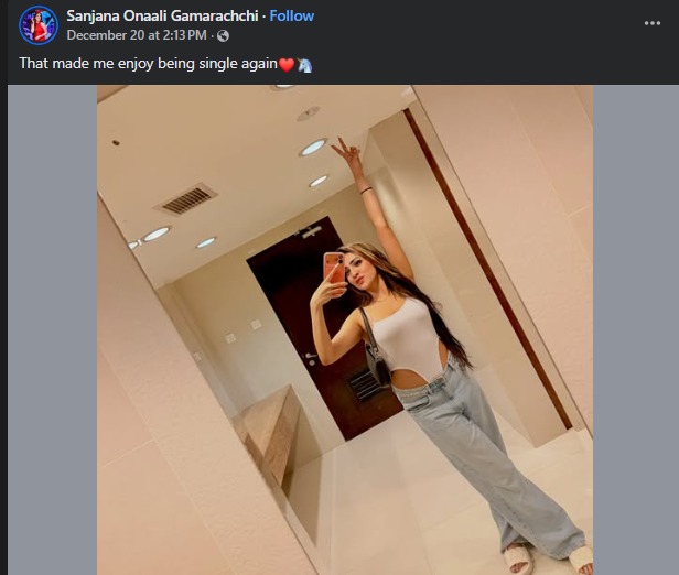 ”That made me enjoy being single again” මැයෙන් සංජනා සිය සමාජ මාධ්ය වේදිකාවන් වෙත එක්කළ ඡායාරූපයක් තමයි මේ කතාබහ ඇති කරන්න හේතු හදලා තිබුණෙ.