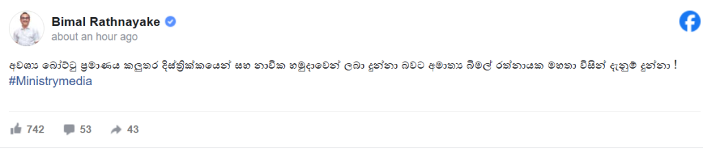 අමාත්යවරයාගේ සමාජජාල පළ කිරීමේ දැනුම් දෙන්නේ, කොලොන්නාව ගංවතුරෙන් යට වූ ප්රදේශවලට යොමුවීමට බෝට්ටු සැපයීම සඳහා දුරකථන අංක සමඟින් ඉල්ලීමක් කර ඇති බවයි.