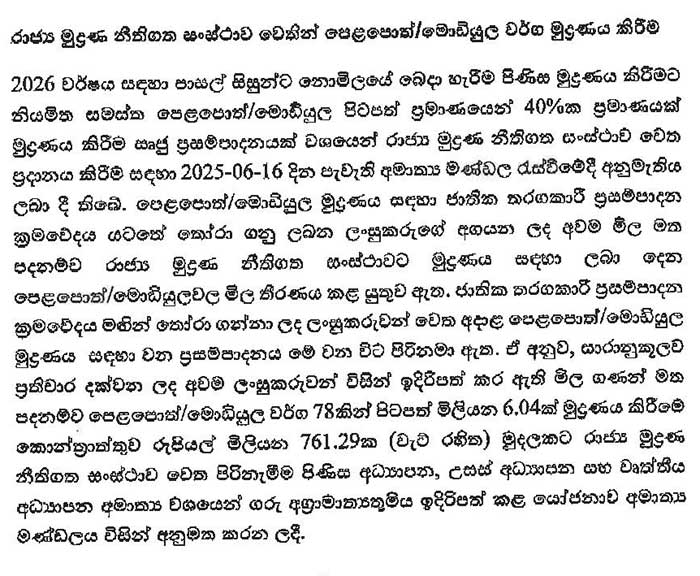 2026 වර්ෂය සඳහා පාසල් සිසුන්ට නොමිලයේ බෙදා හැරීම පිණිස මුද්රණය කිරීමට නියමිත සමස්ත පෙළපොත්/ මොඩියුල පිටපත් ප්රමාණයෙන් 40%ක ප්රමාණයක් මුද්රණය කිරීම ඍජු ප්රසම්පාදනයක් වශයෙන් රාජ්ය මුද්රණ නීතිගත සංස්ථාව වෙත ප්රදානය කිරීම සඳහා 2025 -06-16 දින පැවැති අමාත්ය මණ්ඩල රැස්වීමේදී අනුමැතිය ලබා දී තිබේ.