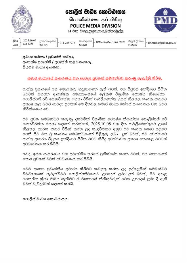 නිවේදනයක් නිකුත් කරමින් පොලිස් මාධ්ය කොට්ඨාසය සඳහන් කර ඇත්තේ, අදාළ පුවත තරයේ ප්රතික්ෂේප කරන බවත්, එය සත්යයෙන් තොර පුවතක් බවට අවධාරණය කරන බවය.