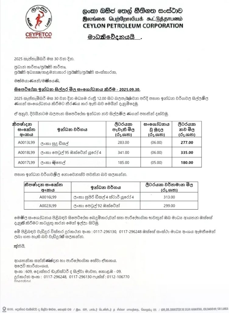 කෙසේ වෙතත් පෙට්රල් ඔක්ටේන් 92 සහ ලංකා සුපර් ඩීසල් මිල නොවෙනස්ව පවතින බව ලංකා ඛනිජ තෙල් නීතිගත සංස්ථාව නිවේදනය කළේය.