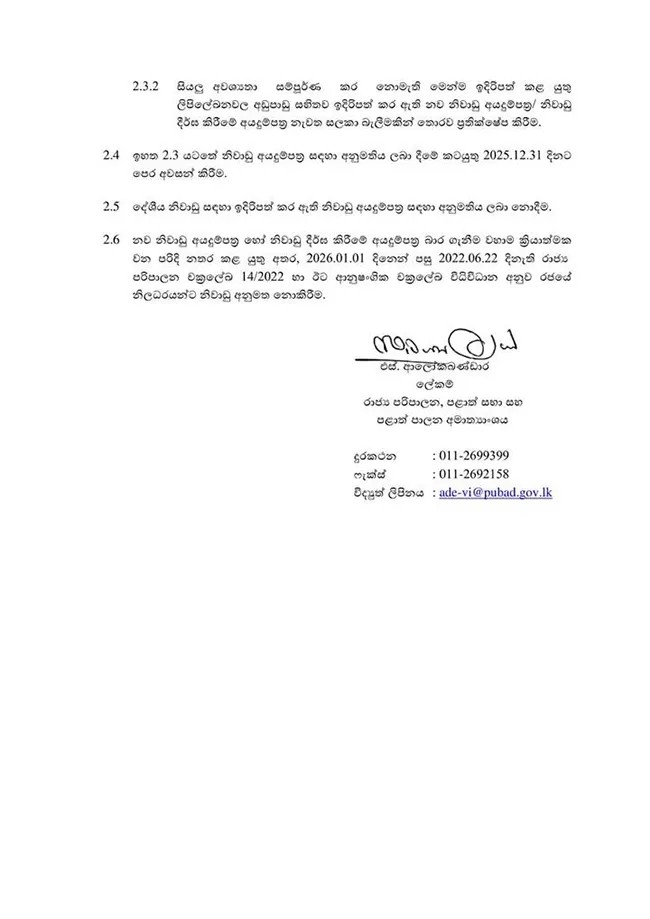 ඒ අනුව නව නිවාඩු අයදුම්පත්ර හෝ නිවාඩු දීර්ඝ කිරීමේ අයදුම්පත්ර භාරගැනීම වහාම ක්රියාත්මක වන පරිදි නතර කළ යුතු බව අමාත්යාංශ ලේකම්වරයා, සියලුම අමාත්යාංශ ලේකම්වරුන්, පළාත් ප්රධාන ලේකම්වරුන් හා දෙපාර්තමේන්තු ප්රධානීන් වෙත අදාළ චක්රලේඛය මගින් දැනුම් දී ඇත.