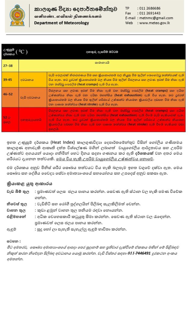 බස්නාහිර, සබරගමුව, දකුණු සහ වයඹ පළාත්වලත් අනුරාධපුරය, මන්නාරම සහ වවුනියාව දිස්ත්රික්කවලත් ඇතැම් ප්රදේශවල උණුසුම් දර්ශකය, එනම් මිනිස් සිරුරට දැනෙන උණුසුම ” අවධානය යොමු කළ යුතු ” මට්ටමක පැවතිය හැකි බව කාලගුණ විද්යා දෙපාර්තමේන්තුව පවසයි.