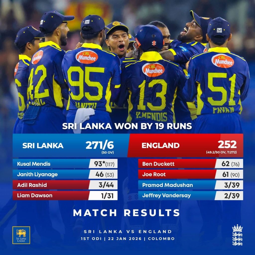 ශ්රී ලංකාව හා සංචාරක එංගලන්ත කණ්ඩායම අතර පැවැතුණු පළමු එක්දින ක්රිකට් තරගයෙන් ලකුණු 19ක ජයක් ශ්රී ලංකා කණ්ඩායම අත් කර ගත්තේය.