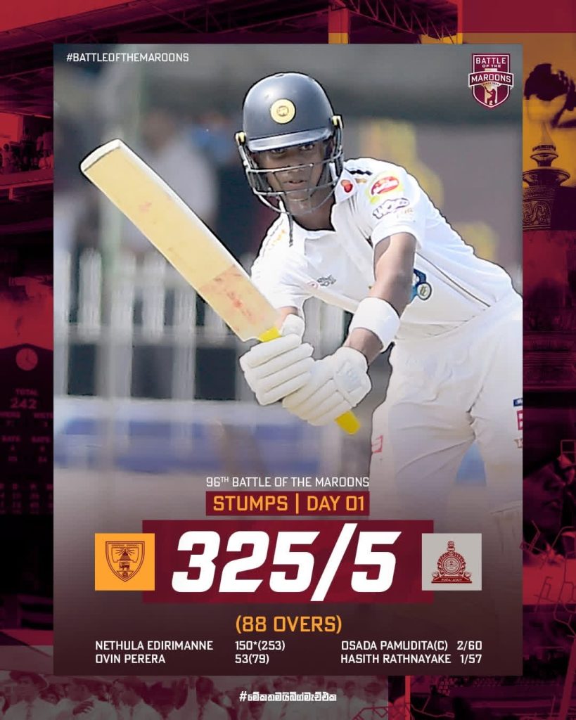 දිනය අවසන් වන විට ආනන්ද කණ්ඩායම පළමු ඉනිමට කඩුලු 5කට ලකුණු 325ක් ලබා ගෙන සිටියි.