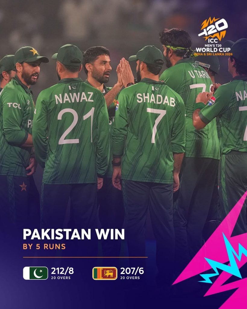 T 20 ලෝක කුසලානයේ පාකිස්ථානය එරෙහිව ශ්රී ලංකා කණ්ඩායමට ලකුණු 5ක පරාජයක් අත්විඳ ගත්තේය.