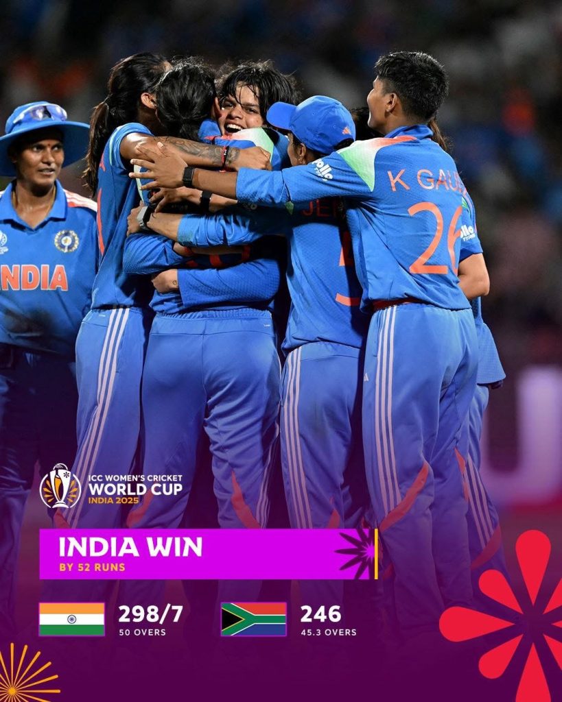 2025 කාන්තා එක්දින ලෝක කුසලානයේ ශූරතාව දිනා ගන්නට ඉන්දිය කාන්තා කණ්ඩායමට හැකියාව ලැබුණේ අවසන් තරගයේදී දකුණු අප්රිකා කාන්තා කණ්ඩායම ලකුණු 52කින් පරාජය කරමින්.