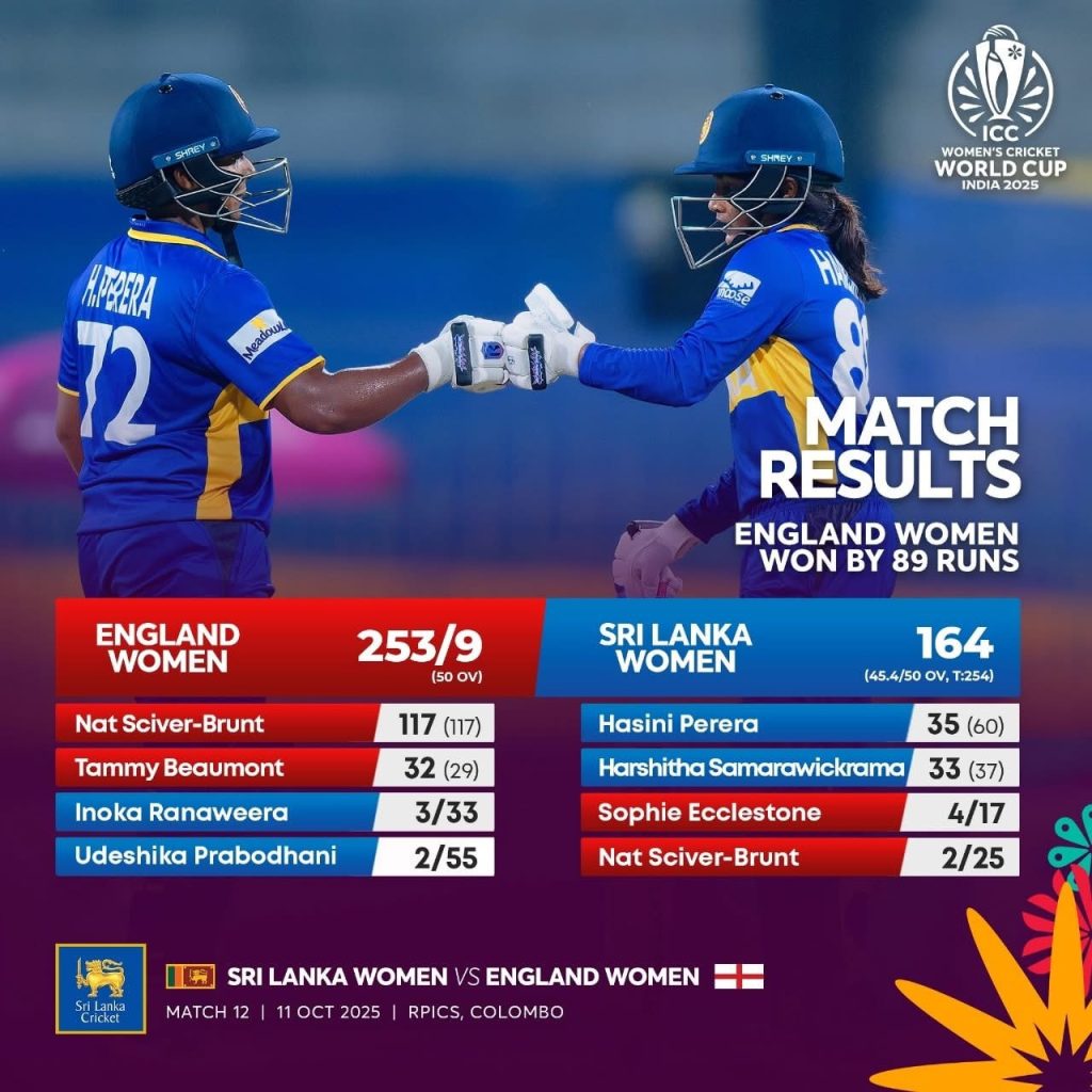 කාන්තා ලෝක කුසලාන එක්දින ක්‍රිකට් තරගාවලියේ ශ්‍රී ලංකා කාන්තා කණ්ඩායම එංගලන්ත කාන්තා කණ්ඩායම හා පැවතුණු තරගය ලකුණු 89කින් පරාජය විය.