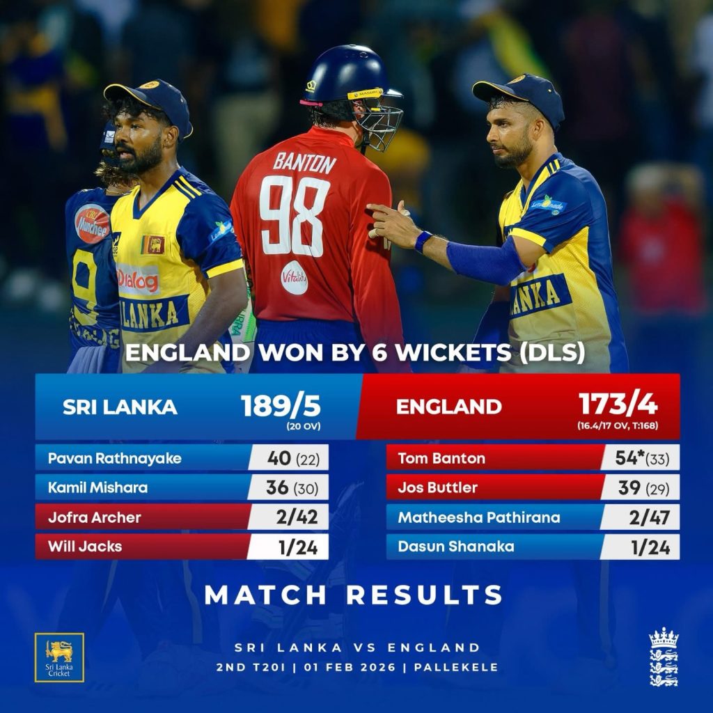 සංචාරක එංගලන්ත කණ්ඩායම හමුවේ දෙවන T 20 ක්රිකට් තරගයෙන්ද කඩුලු 6ක පරාජයක් ලැබීමට ශ්රී ලංකා කණ්ඩායමට සිදුවිය.