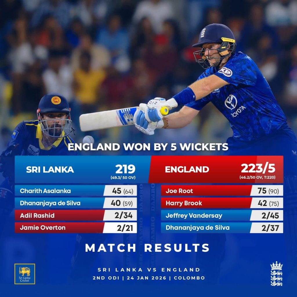 ශ්රී ලංකා හා පැවැතුණු දෙවැනි එක්දින ක්රිකට් තරගය කොළඹ R.ප්රේමදාස ක්රිකට් ක්රීඩාංගණයේදී කඩුලු 5කින් ජය ගැනීමට එංගලන්ත කණ්ඩායම සමත් විය.