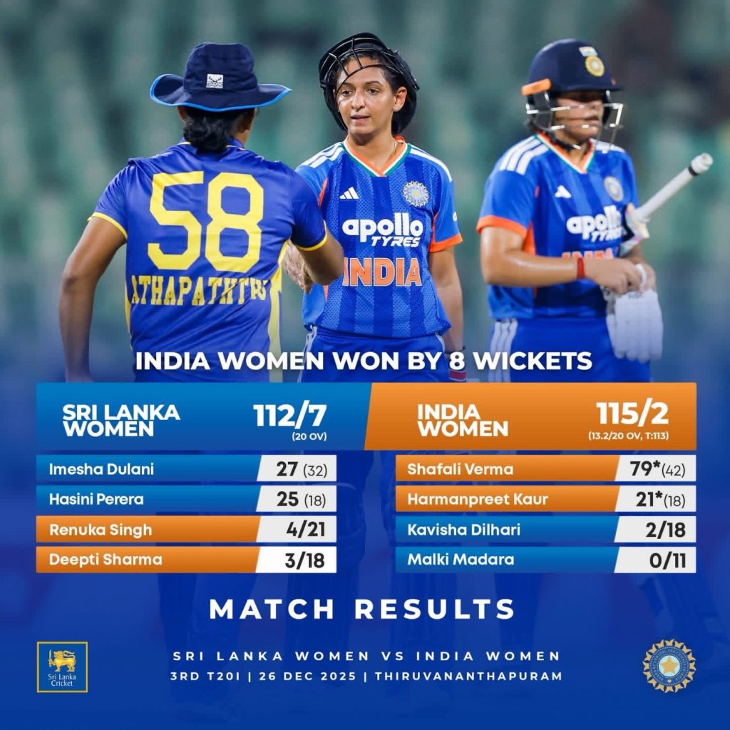 සංචාරක ශ්රී ලංකා කාන්තා කණ්ඩායම සමග පැවැති තුන්වන T 20 තරගය ද කඩුලු 8කින් ජය ගත් ඉන්දියා කාන්තා කණ්ඩායම තරගාවලිය තරග 3-0ක් ලෙස ජය ගන්නට සමත් විය.