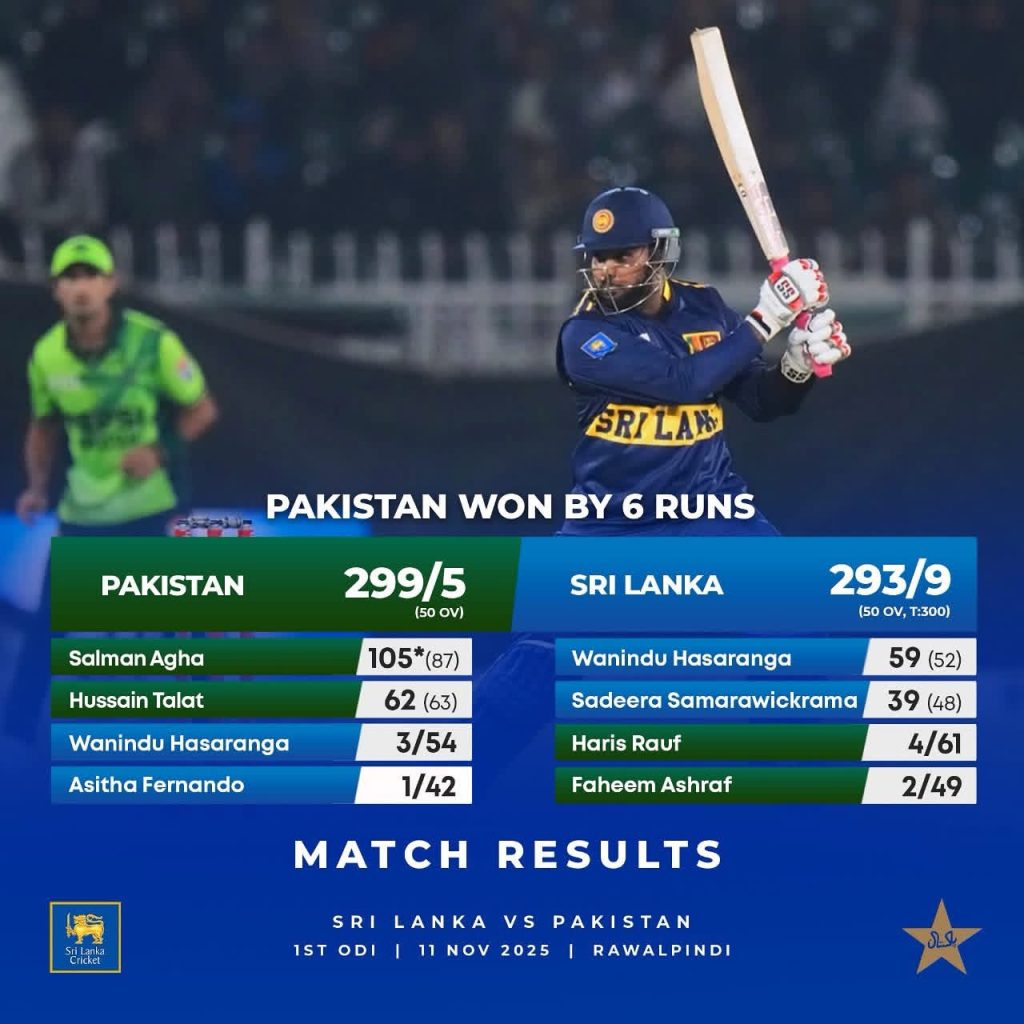 ශ්‍රී ලංකාව හා පාකිස්ථානය අතර පැවැතුණු පළමු එක්දින ක්‍රිකට් තරගය ලකුණු 6කින් ජය ගැනීමට පාකිස්ථාන කණ්ඩායම සමත් විය.