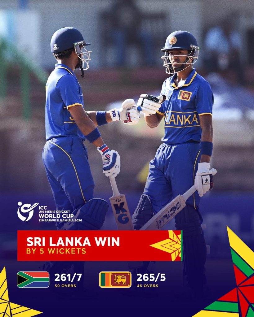 වයස 19න් පහළ ලෝක කුසලාන එක්දින තරගාවලියේ දකුණු අප්‍රිකා වයස 19 කණ්ඩායම සමග තරගය කඩුලු 5කින් ශ්‍රී ලංකා වයස 19න් පහළ කණ්ඩායම ජය ගත්තේය.