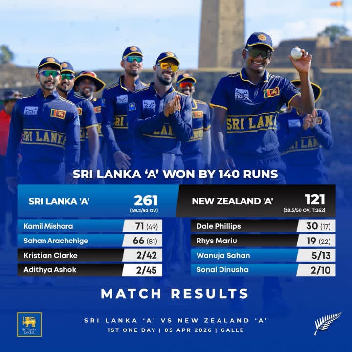 නවසීලන්ත A හා ශ්රී ලංකා A අතර ගාල්ල ජාත්යන්තර ක්රිකට් පිටියේදී පැවැති පළමු එක්දින තරගය ශ්රී ලංකා A කණ්ඩායම ලකුණු 140කින් ජය ගත්තේය.