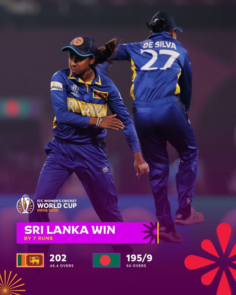 කාන්තා එක්දින ක්රිකට් ලෝක කුසලාන තරගාවලියේ බංග්ලාදේශය සමග තරගය ලකුණු 7කින් ජය ගැනීමට ශ්රී ලංකා ක්රීඩිකාවෝ සමත් විය.