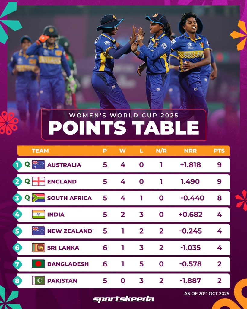 ශ්රී ලංකාව ප්රසාද ලකුණු 4ක් සමග සටහනේ 6 වන තැන පසුවන අතර ඔවුන්ට අවසන් පූර්ව වටයට පිවිසීමට නම් පාකිස්ථාන තරගය ජය ගත යුතුවෙයි.