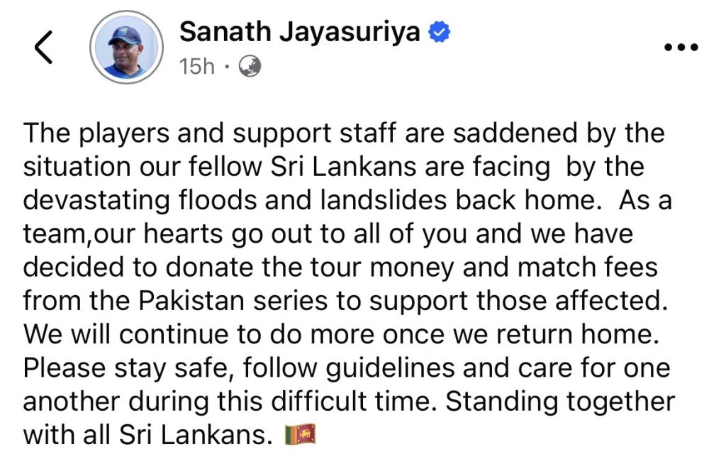 ඒ අනුව පාකිස්ථාන තරගාවලියේදී ශ්‍රී ලංකා ක්‍රිකට් කණ්ඩායම ලබන සියලුම මුදල් අපේම රටේ ජනතාව වෙනුවෙන් ලබා දීමට ක්‍රීඩකයින් හා පුහුණුකරුවන් තීරණය කළ බව ශ්‍රී ලංකා ක්‍රිකට් කණ්ඩායමේ ප්‍රධාන පුහුණුකරු සනත් ජයසූරිය මහතා පවසනවා.